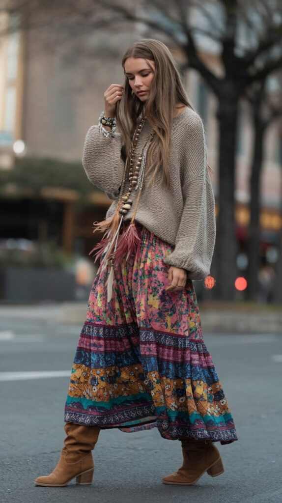 The colorful, free-spirited Bohemian style immediately catches the eye. Our recipe for boho-chic involves a bright printed maxi skirt, loose-knit jumper, brown knee-high boots, with beads, feathers, and woven pieces as garnish. A trend you shouldn’t miss in 2024
