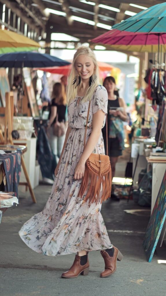 Step into the world of whimsy with our Bohemian Chic attire. This vibrant floral maxi dress fitted with warm-toned accessories captures the free-spirited essence of Boho-chic style. Brace yourself for a unique journey of self-expression