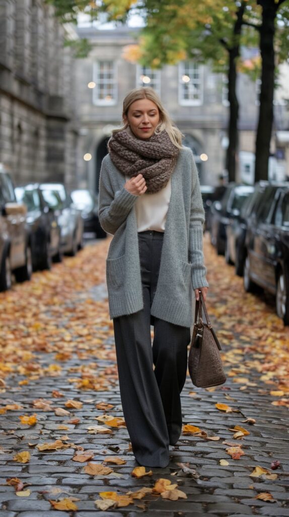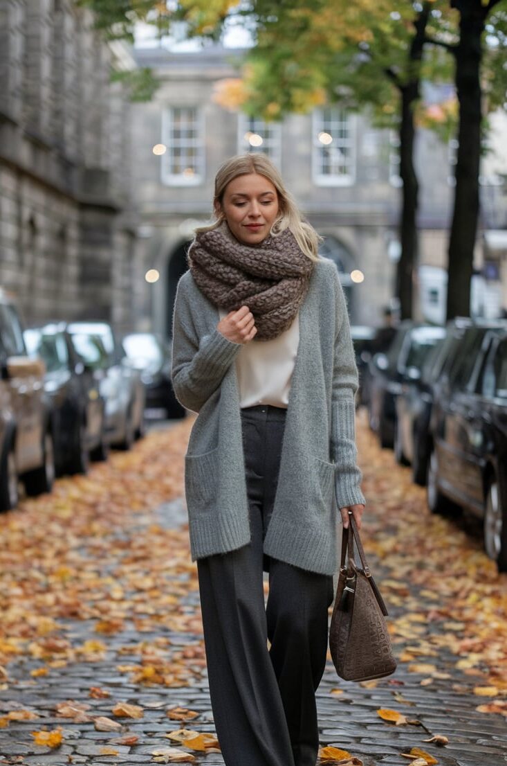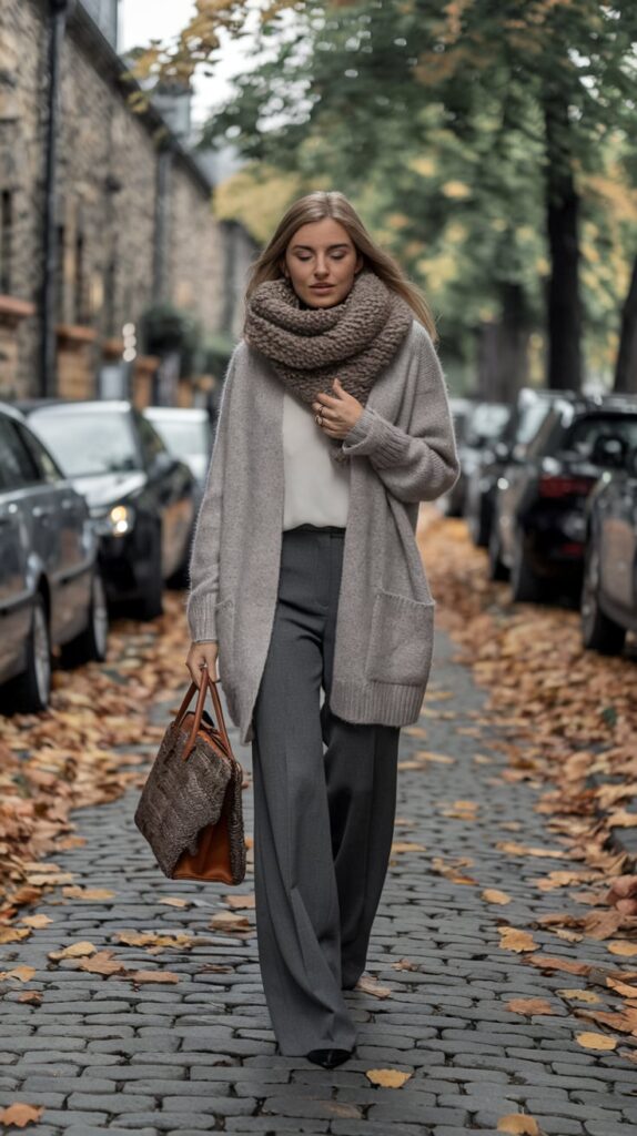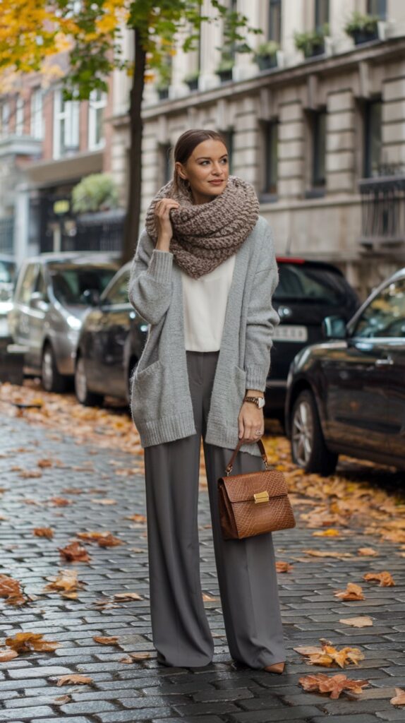 Embrace the winter season with a cozy ensemble. A gray cardigan and wide-leg trousers are perfectly complemented by a chunky brown scarf and matching bag.🍂🍁