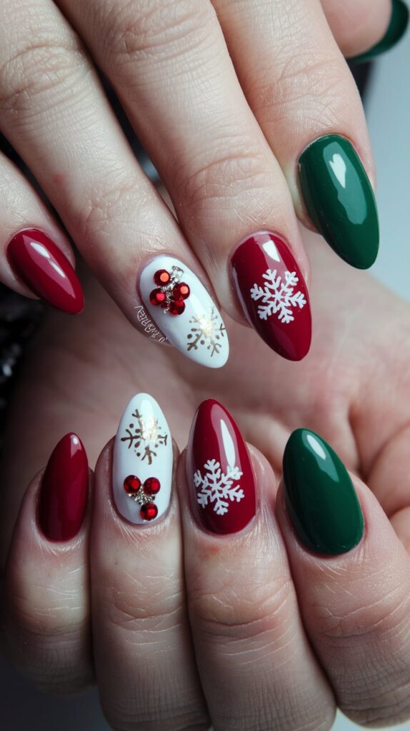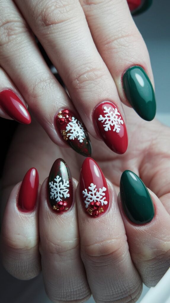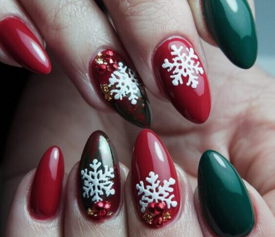 Embrace the holiday spirit with a beautiful manicure in red and green. Adorned with intricate snowflakes and sparkling rhinestones, these nails are perfect for any Christmas celebration.π