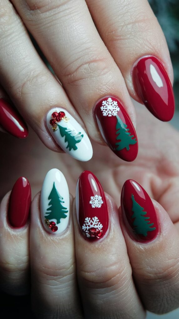 Get ready for the festivities with this stunning nail design. Glossy red and green hues combined with snowflake patterns and shimmering accents bring holiday cheer to your fingertrips. β¨π
